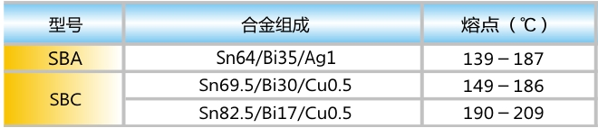 電子工業(yè)無鉛化,及時雨焊料及時推出了系列中溫合金無鉛焊錫膏,采用新型無鉛焊料合金SnBi35Ag1/SnBi30Cu0.5/SnBi17Cu0.5/制成。